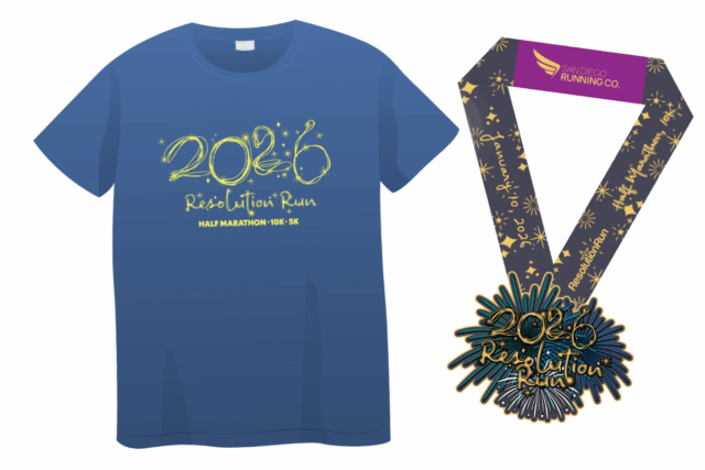 - All participants receive a San Diego Resolution Run shirt, custom finisher medal, bib and chip-timed results.